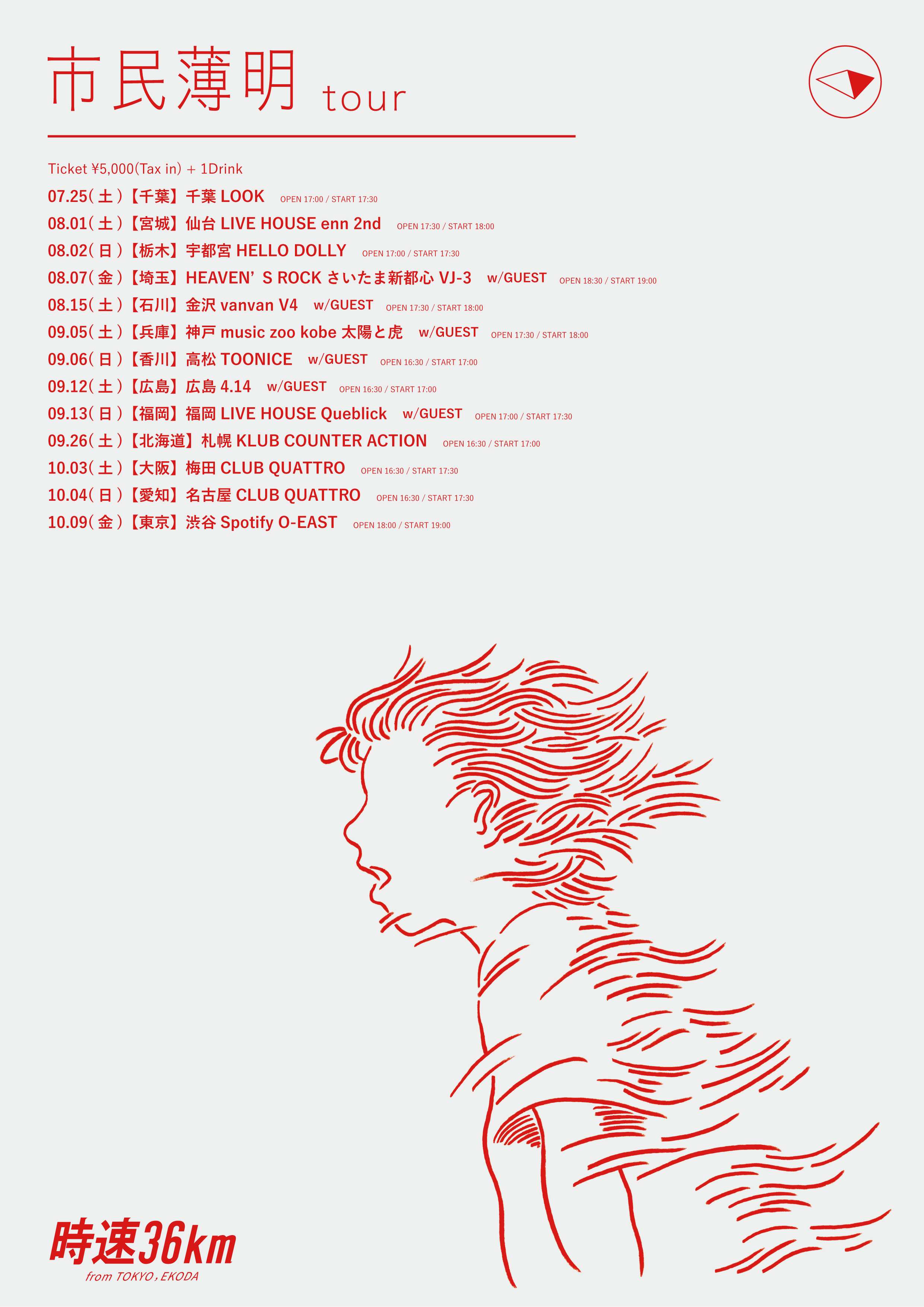 時速36km presents “市民薄明 Tour”GUESTは後日発表!<Ticket>前売り ¥5,500▼「その未来/ハロー」CD封入先行(抽選)受付期間:4/24(水)10:00〜5/6(水)23:59